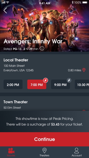 Note: the actual Peak Pricing surcharge will vary based on showtime and movie title.