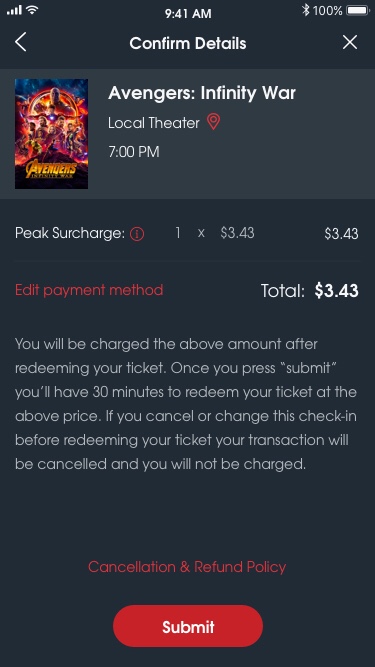 If you’ve selected a showtime in Peak Pricing, you’ll see a confirmation screen with details on the surcharge. After you submit, you can check in to your movie and your card on file will be charged. You can always change your card on file by clicking “Edit payment method.”